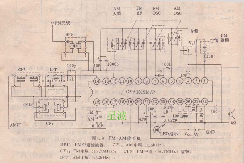 CXA1019 IC是日本索尼公司的产品,其外形有大直插、小直插和贴片三种。本集成块包括了调幅和调频的全部电路,具有外围元件少,适应电压范围广,耗电省,灵敏度高,失真小等优点,多年来一直被广泛应用。