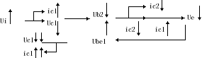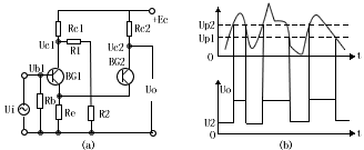 工作原理:设输入ui如图一(b)示,当ui=0时,电路处于BG1截止,BG2导通的稳定状态。这时输出电压为:uo=u2=Ec-(ue2/Re)Rc2