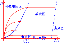 它的输出特性曲线如图(3)所示,它也分为4个区:可变电阻区、放大区、截止区和击穿区。