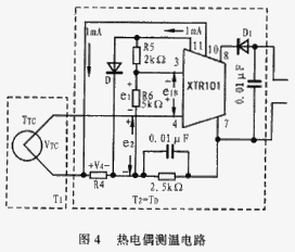 图4是一个热电偶测温电路。热电偶的输出电动热与工作端温度(被测温度)T1的对应关系通常是以冷端温度(环境温度)T2=0为标准进行标定的,当T2≠0时需进行冷端处理。图4中是利用二极管D的管压降经过分压后再由R6上的电压对热电偶迸行冷端补偿的。