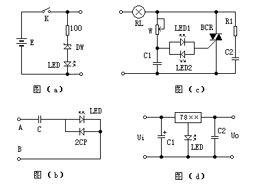 图(b)是LED用在220V、50Hz市电中,作为电器具工作指示或保险丝熔断指示。